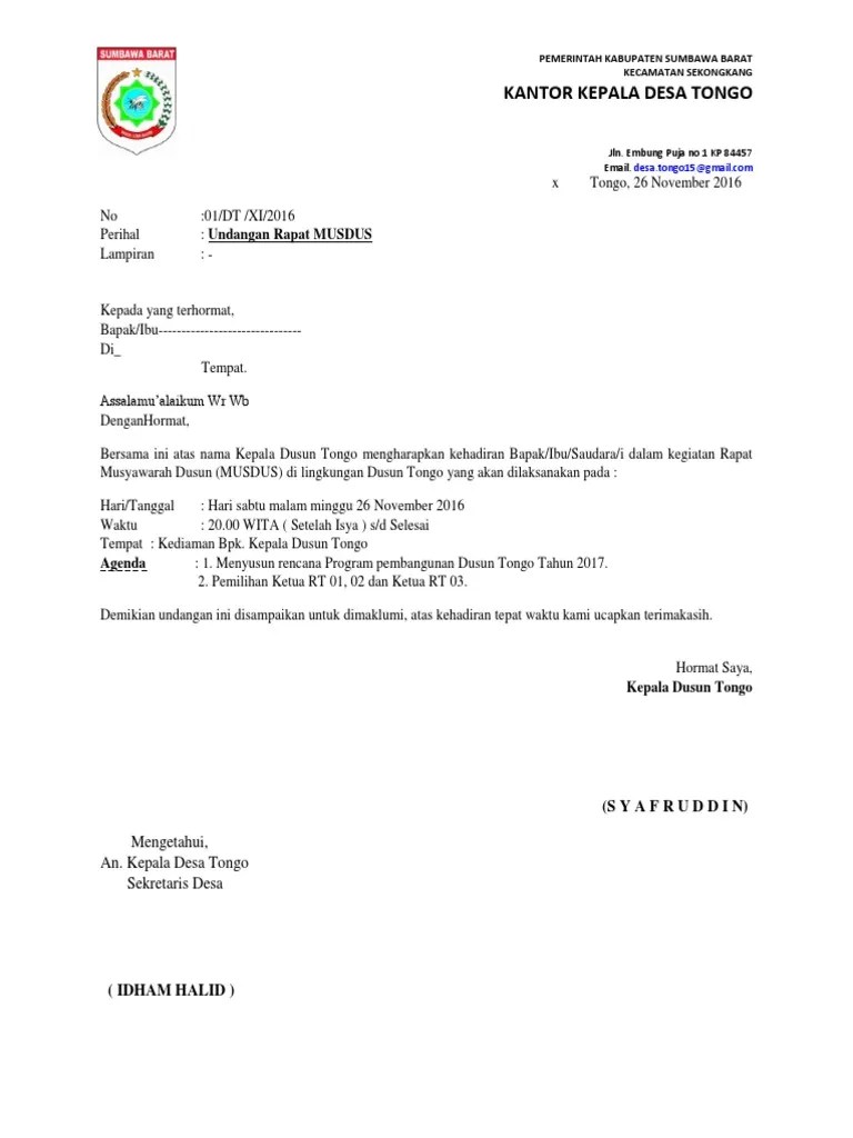 Contoh surat undangan rapat terbaru untuk rapat desa, perusahaan, rt rw, sekolah, dinas resmi, semi block style, kantor, guru, osis, meeting kerja, dll.